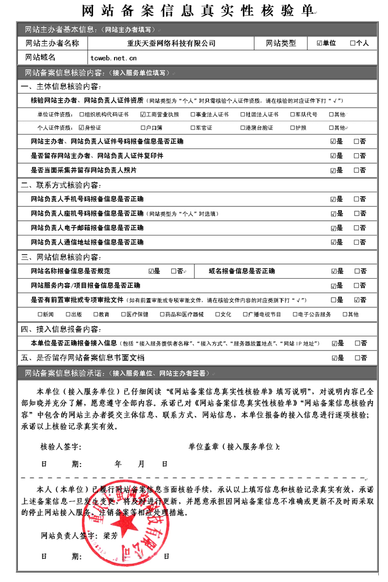 如我公司天蠶重慶網(wǎng)絡(luò)公司委托經(jīng)辦人梁芳去辦理網(wǎng)站備案,那么,網(wǎng)站備案的核驗(yàn)單填寫方法如下范例:
