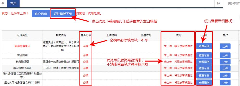 第一步 :登陸平臺(tái) 地址:tx.k400.cc 第二步:輸入您的400號(hào)碼,輸入你的密碼 登陸完成之后,為保障您企業(yè)信息安全,建議修改密碼。 第三步:按照平臺(tái)提示部分進(jìn)行操作,先在下載證件模版,進(jìn)行解壓 按照里面的復(fù)機(jī)要求文件準(zhǔn)備相關(guān)的資質(zhì)文件,如果不清楚具體的規(guī)范,可參照后面的查看示例進(jìn)行比對(duì)。平臺(tái)上有具體的標(biāo)識(shí)。